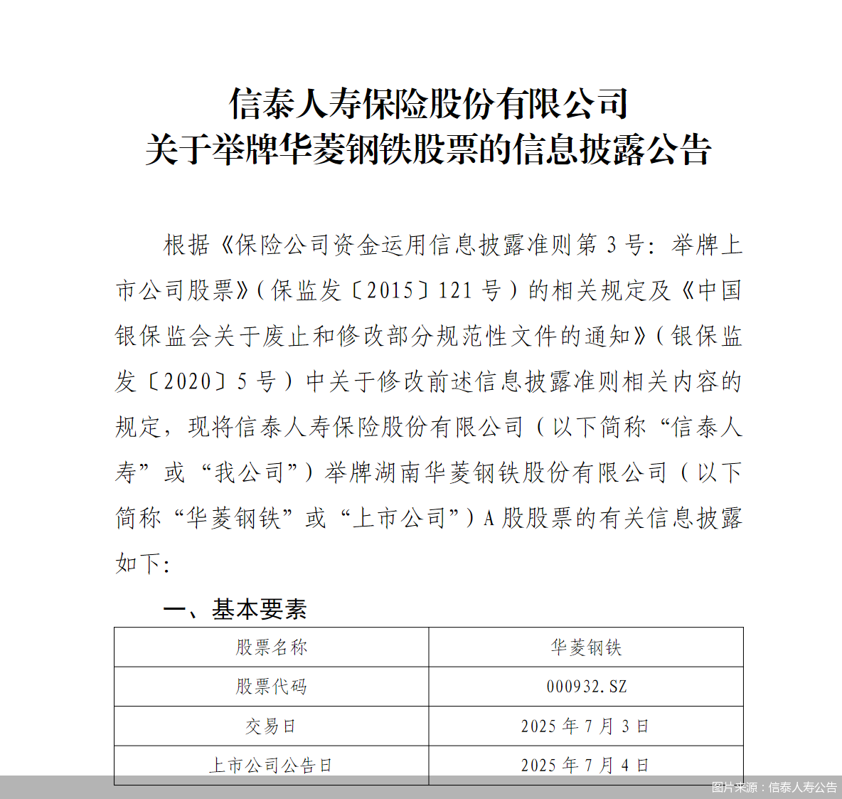 北京商报讯(记者 李秀梅)7月4日,信泰人寿保险股份有限公司(以下简称“信泰人寿”)公告显示,该公司触发了对华菱钢铁(000932)举牌。